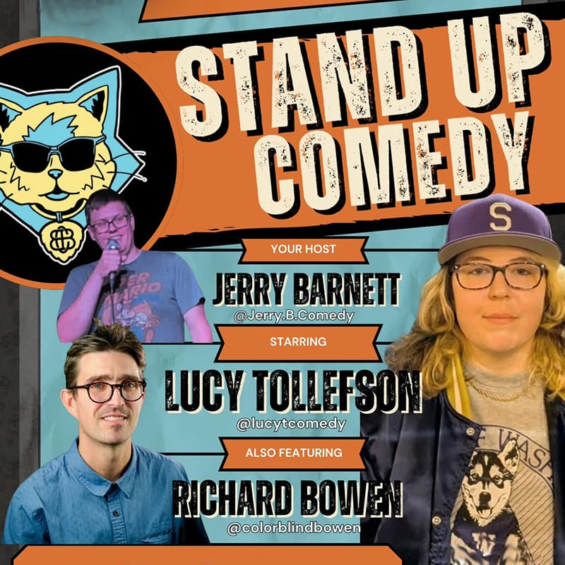 Stand Up Comedy @ Beach Cat brings a night of live laughs to Bellingham with a hosted stand-up showcase and open mic at the South Paw event space, featuring host Jerry Barnett, headliner Lucy Tollefson, and sets from Richard Bowen, with open mic sign-ups at 7:30 pm and the show starting at 8:00 pm for ages 18 and up.