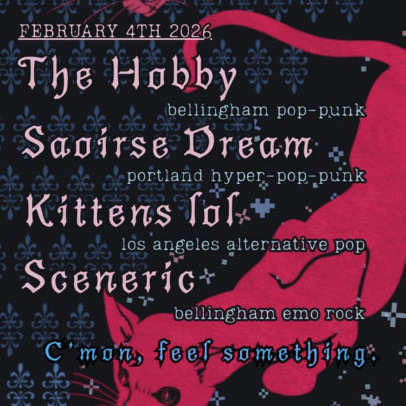 Visceral, uncompromising; The Hobby is a heavy rock band from Bellingham, combining the energy and emotion of early-aughts emo, the sullen atmosphere of the late-90s alternative scene, and the hooks and earworms of contemporary pop. At the Shakedown tonight, February 4, at 8:30 pm.