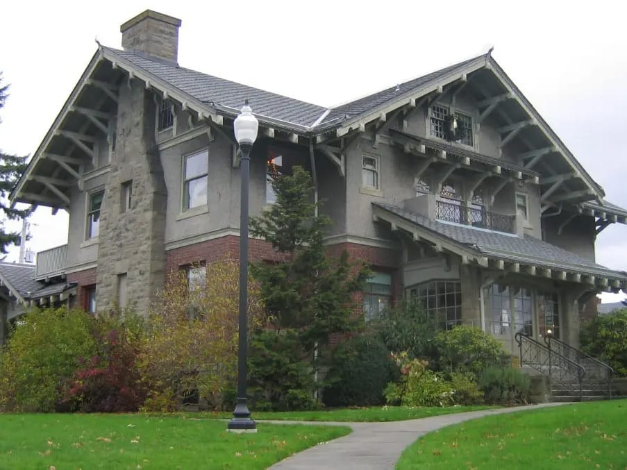 The Roeder home was designed by Alfred Lee, the architect behind Old Main and the Whatcom Museum of History and Art. Its design blends Bracketed Gothic and American Stick Style elements, (yeah, I had to Google those too. 😜) with brick and stucco exterior walls and entrances trimmed in Chuckanut sandstone. From the photos I’m finding it looks like the interior was mostly trimmed out in oak, which is a little unusual for an early Bellingham home. Good question for the tour.